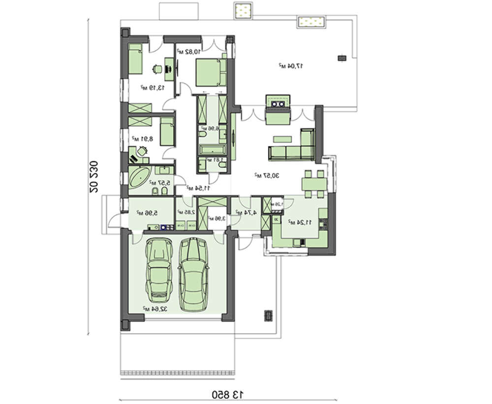 Для того щоб забезпечити повноцінний якісний відпочинок, простір поверху розділений на три зони. Гараж представлений просторим приміщенням для зберігання двох автомобілів і окремою кімнатою, яку можна використовувати для проведення сервісних робіт і зберігання, необхідного в господарстві інструменту.