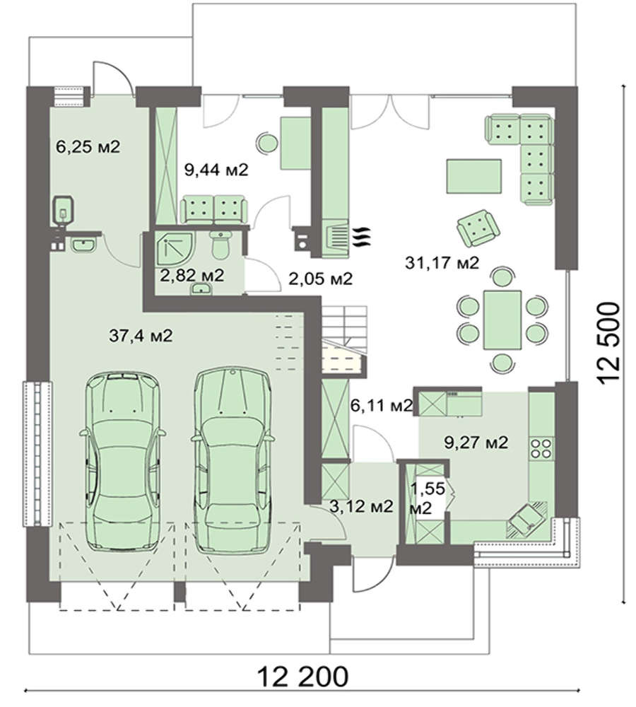 Простір вітальної зони, отриманий об'єднанням всіх місць для спільного проведення часу. Вихід на веранду дає можливість зустрічати гостей, минаючи господарські приміщення. Кухня віднесена в кутову частину і полуобособлена. Залишаючи всі харчові запахи в невеликому спеціально відведеному місці, планування дозволяє господарці бути в курсі всіх подій, відбуваються в кімнаті. Включення гаражного простору в габарити житлового будинку високо цінують господарі-автолюбителі. З'являється можливість зберігання двох автомобілів і їх технічне обслуговування виконувати в комфортних умовах.