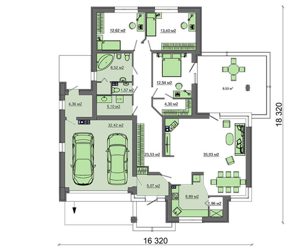 Внутрішня площа будинку розділена на три практично окремі зони: технічну, житлову і вітальню. Простір гаража дозволяє зберігати дві транспортні одиниці. Примикаюче приміщення виділено на виконання сервісних робіт.
