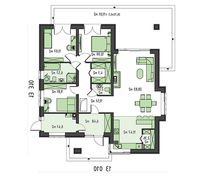 Трьох спальних апартаментів досить для комфортного відпочинку всіх членів середньостатистичної сім'ї. Розміри кімнат розраховані на розміщення компактного меблевого гарнітура. Їх відокремлене від вітальні розташування допомагає мешканцям повноцінно відпочивати і насолоджуватися тишею. Простора віранда дає можливість багато часу проводити на свіжому повітрі серед розкішних троянд і бузку, нескінченно довго слухати солов'їні трелі.