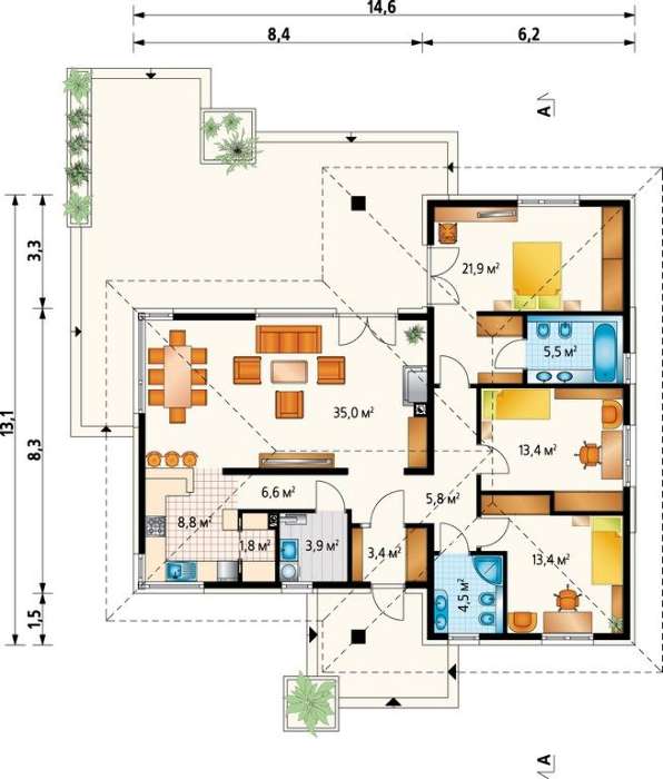 • 4M3317 Затишний 1 поверховий будинок Т-подібної форми